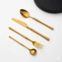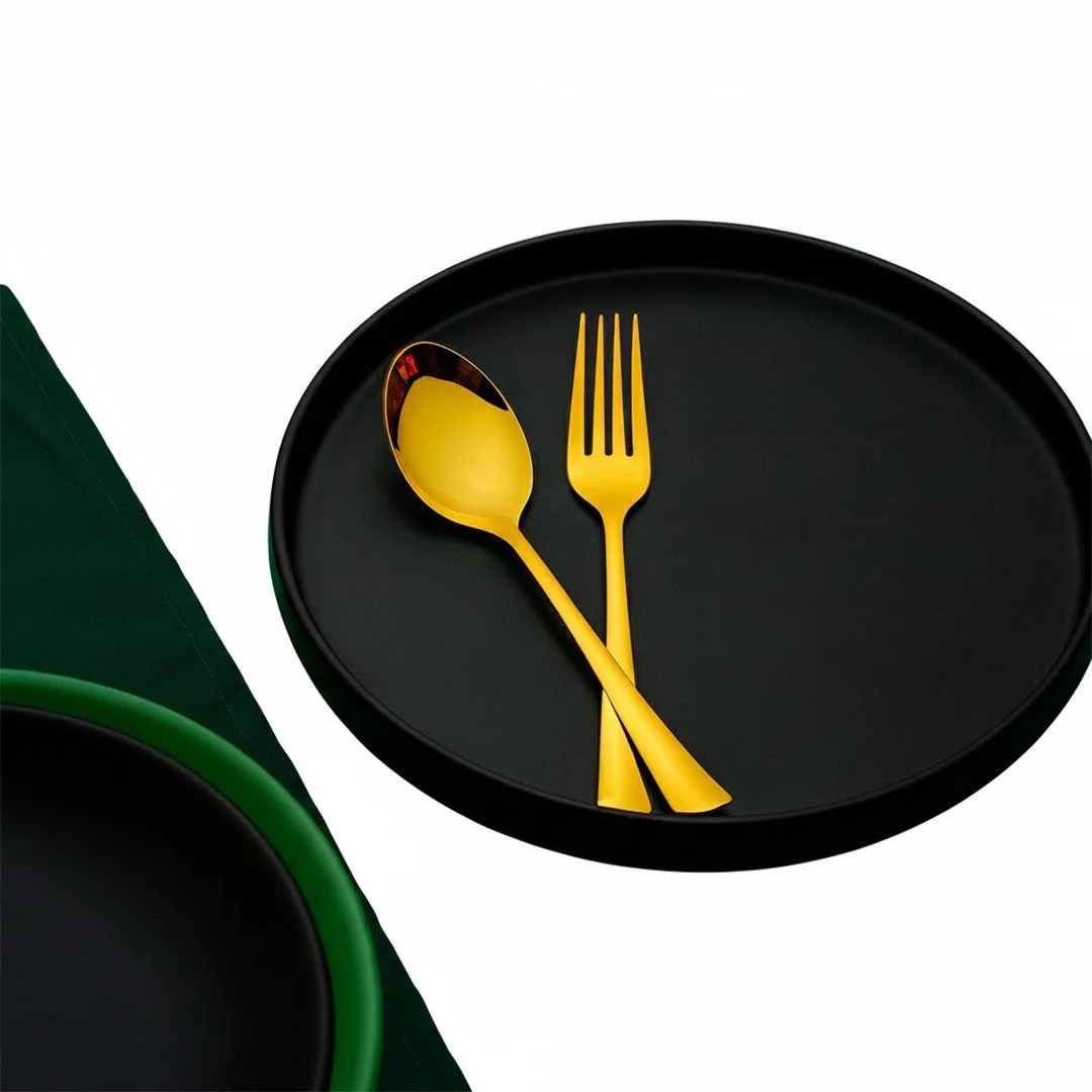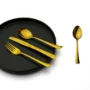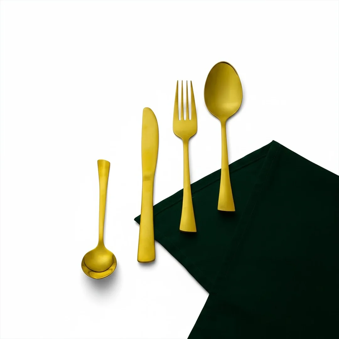 Each piece features a sleek and modern design with smooth contours and a perfectly balanced feel, ensuring comfort and elegance at every meal. The rich gold finish adds a touch of sophistication, making it ideal for everyday dining as well as special occasions.